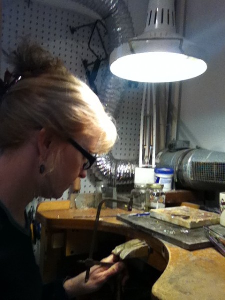 Jewelry designer Beth Judge focuses on her metalwork at the studio bench.