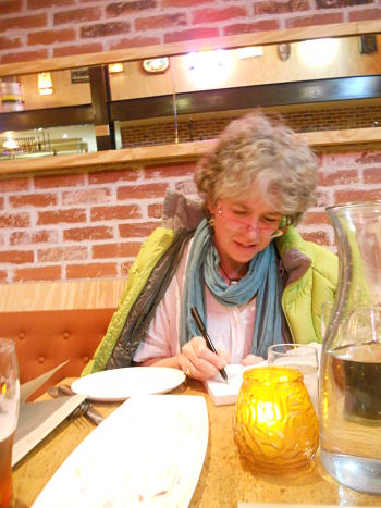 Kathy Crabbe works on cartoon drawings at a local vegan bar.