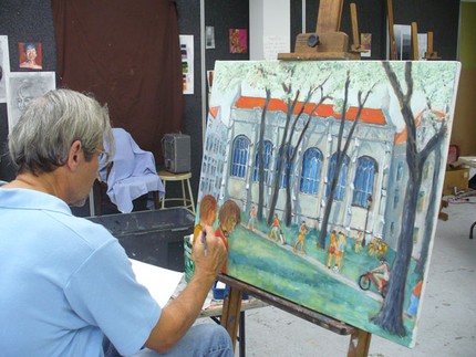 Painter Leon Sarantos concentrates on a new plein air painting.