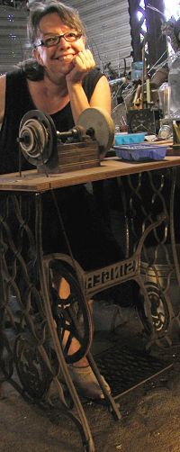 Artist Mckenna Hallett works at a foot-powered treadle to make upcycled jewelry.
