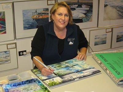 Annie Strack busy at work on a nautical watercolor in her studio.