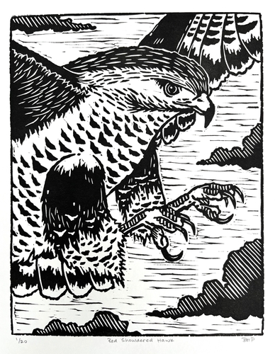 “Red Shouldered Hawk” linocut print, 10″ x 8″